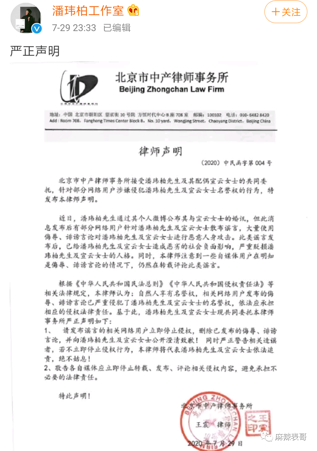 因为这事,潘玮柏微博沦陷了,于是他发出了人生中的第一张律师声明,警告部分网友。