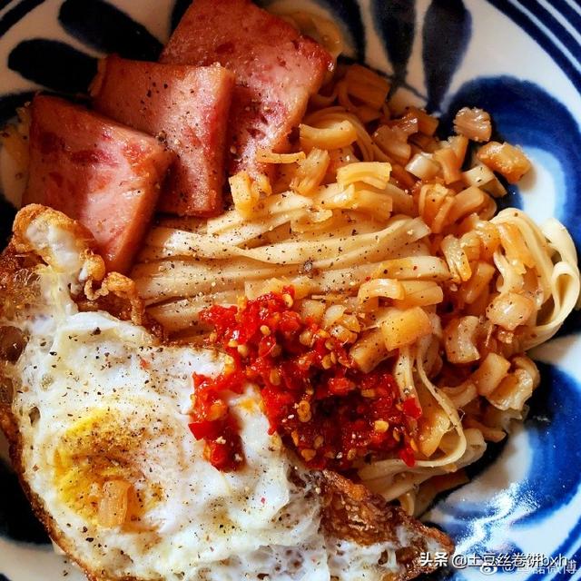 这碗属于干拌面了,鸡蛋、火腿、菜丁和剁椒,撒上点黑胡椒增香。创意十足,味道也十足,难怪说是莉姐四口一碗,绝对是吃起来停不下的节奏。看着就好吃。