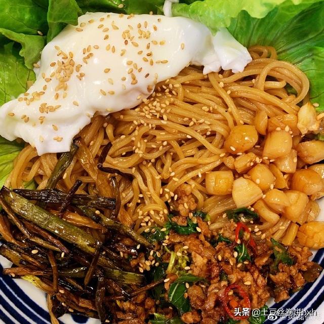 这碗面,是升级版的葱油拌面,黄小厨的配文是:“升级版的葱油拌面,拌料加上泰椒罗勒炒肉末和蒜片干贝,荷包蛋黄搅开,罗马生菜垫底,还有芝麻…莉姐继续保持四口吃一碗面的节奏” 有人爱做,得有人捧场才好,孙莉就是那位绝对给力的观众,每碗都保持着四口一碗。