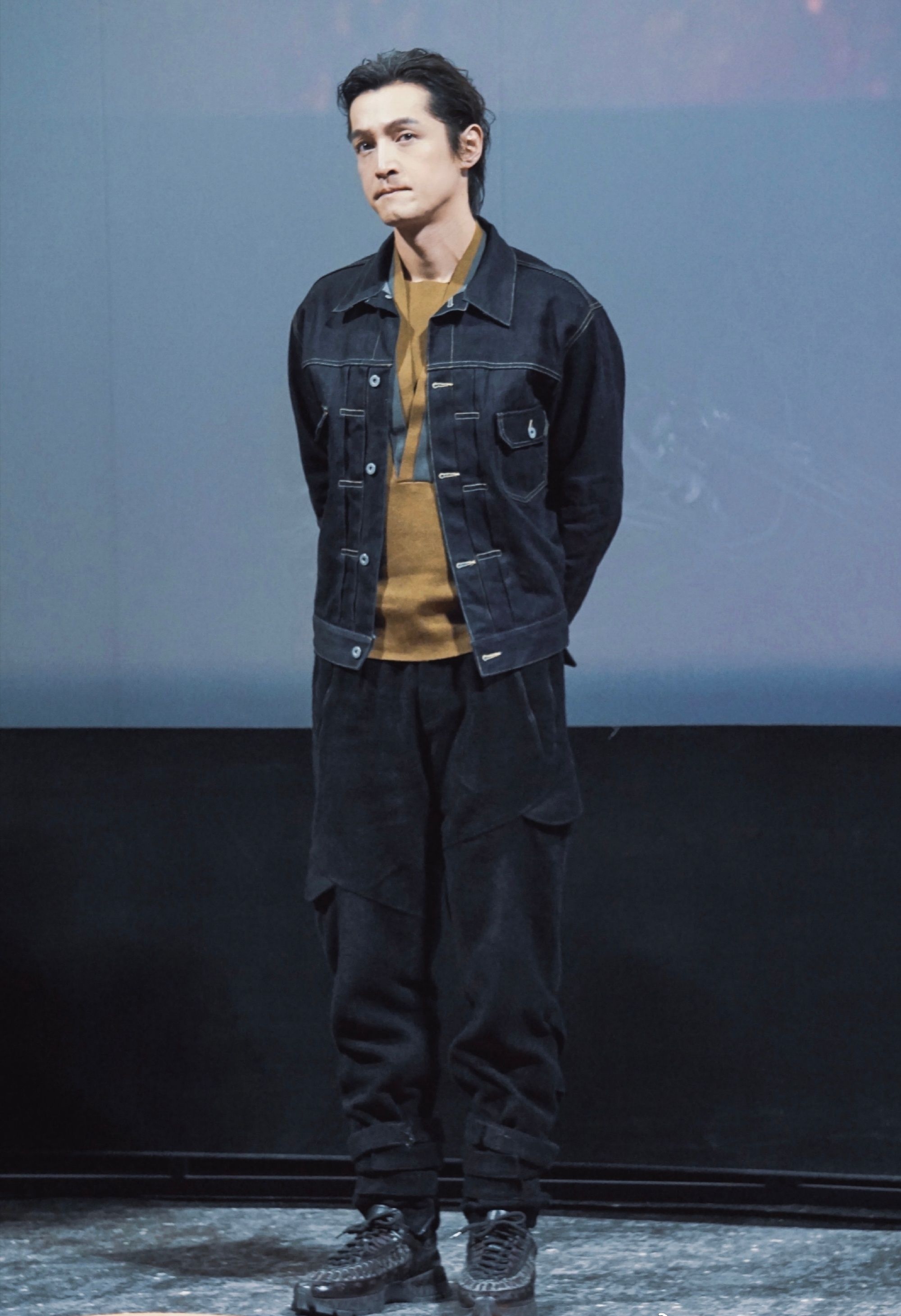 當他穿起減齡牛仔外套的時候,又會多了幾分少年感。胡歌皮膚很白,在深藍色牛仔外套的襯托之下更顯得狀態很好。牛仔深藍色色調和內搭的棕色相搭,冷門的色調搭配反而更加驚艷。壹條黑色工裝褲和高幫鞋子,可以說是又酷又潮。