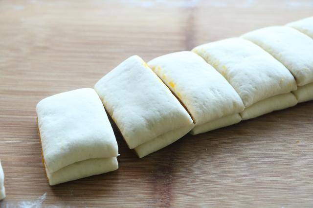 7、先前后折叠起来,再对折起来,切成大小一致的小面剂;