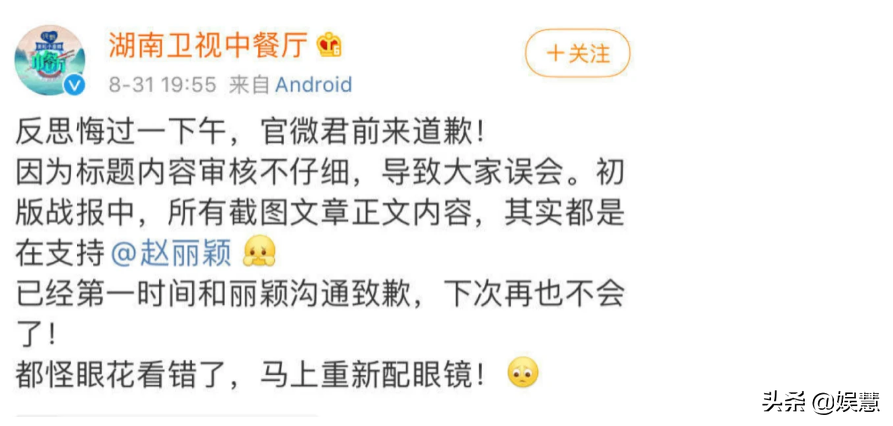 工作室发出声明后,《中餐厅》官微也更新动态向赵丽颖致歉,称所截图的文章标题虽然存在争议,但文章正文都是支持赵丽颖的。他们把审核不仔细称作是“眼花看错了,要马上重新配眼镜。”