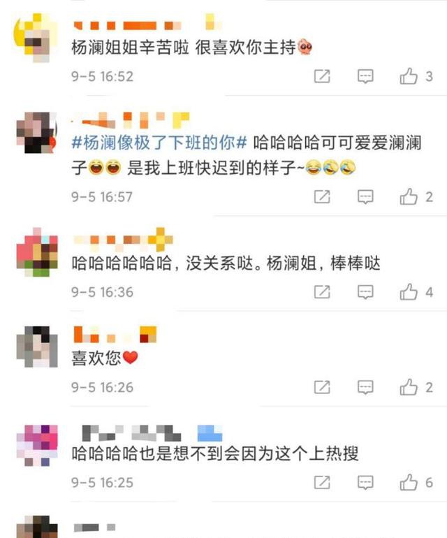 網友紛紛誇楊瀾,“太可愛了”“是我上班快遲到的樣子”“姐姐辛苦啦”,網友又順便誇了誇楊瀾的職業素養。