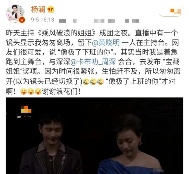 隨後楊瀾在社交平台上解釋了原因,稱在《姐姐》成團夜直播中,因為時間緊張,既要在主持台,又要發布其他獎項,怕來不及,所以才匆匆離開,未顧及現場鏡頭,“像極了上班的你才對”。