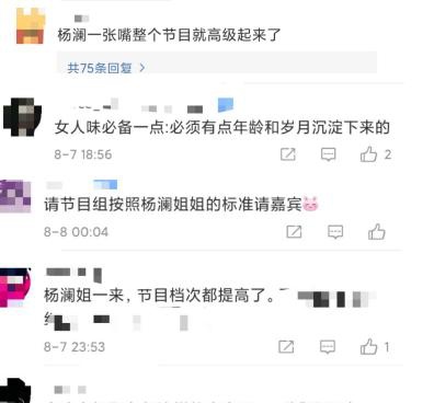 楊瀾的這番話直接點出了節目的主題,強大的控場能力,不管是話題還是切入角度,都很好的體現了《姐姐》的初心。網友們紛紛贊到,“請節目按照楊瀾姐姐的標准請嘉賓”“楊瀾壹張嘴整個節目就高級起來”。