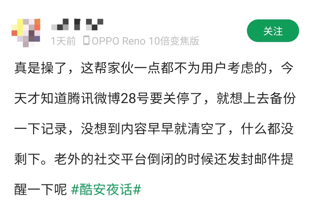 酷安上面的網友也表示還沒等自己備份數據就上不去微博了,就算登進去數據也沒了。。。
