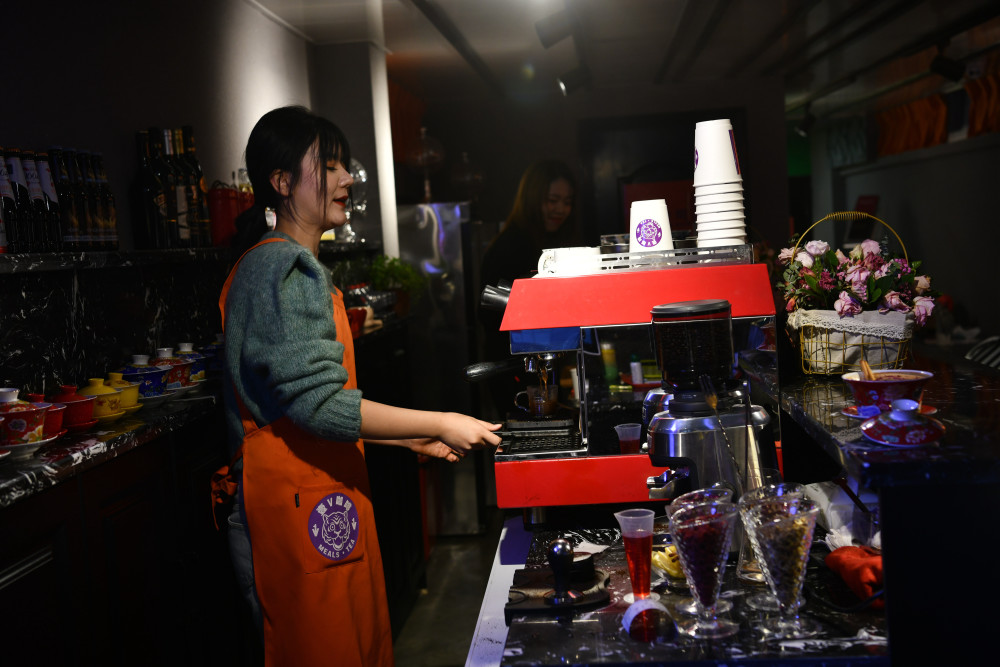 11月27日,在成都市武侯区音乐大道一家咖啡馆内,“95”后美女丁一苇正在忙碌制作新推出的“盖碗咖啡”,该咖啡由丁一苇自创,用中西结合的创意方式吸引了不少年轻人前来尝鲜。