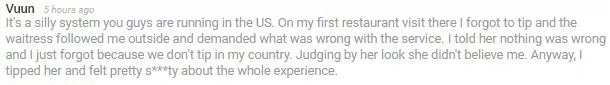 這名外國游客表示,剛來美國時因為沒有支付小費而被服務員追了出來,