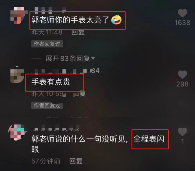 對此,就有網友紛紛表示"郭老師你手表太亮了"。甚至有網友稱,"郭老師說什麼都沒聽見,全程表閃眼。"