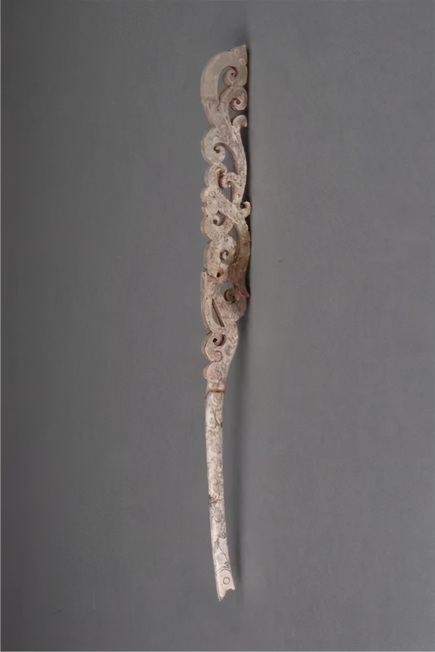 △左邊是商代晚期人首笄形器,右邊是西漢鏤空雲鳳紋白玉笄。殷商時期的古人就開始用簪了,周代起女子滿拾伍歲便算成人,可以許嫁,謂之及笄。沒有嫁,到贰拾歲時也要舉行笄禮,由壹個婦人給及齡女子梳壹個發髻,插上壹支笄,禮後再取下。