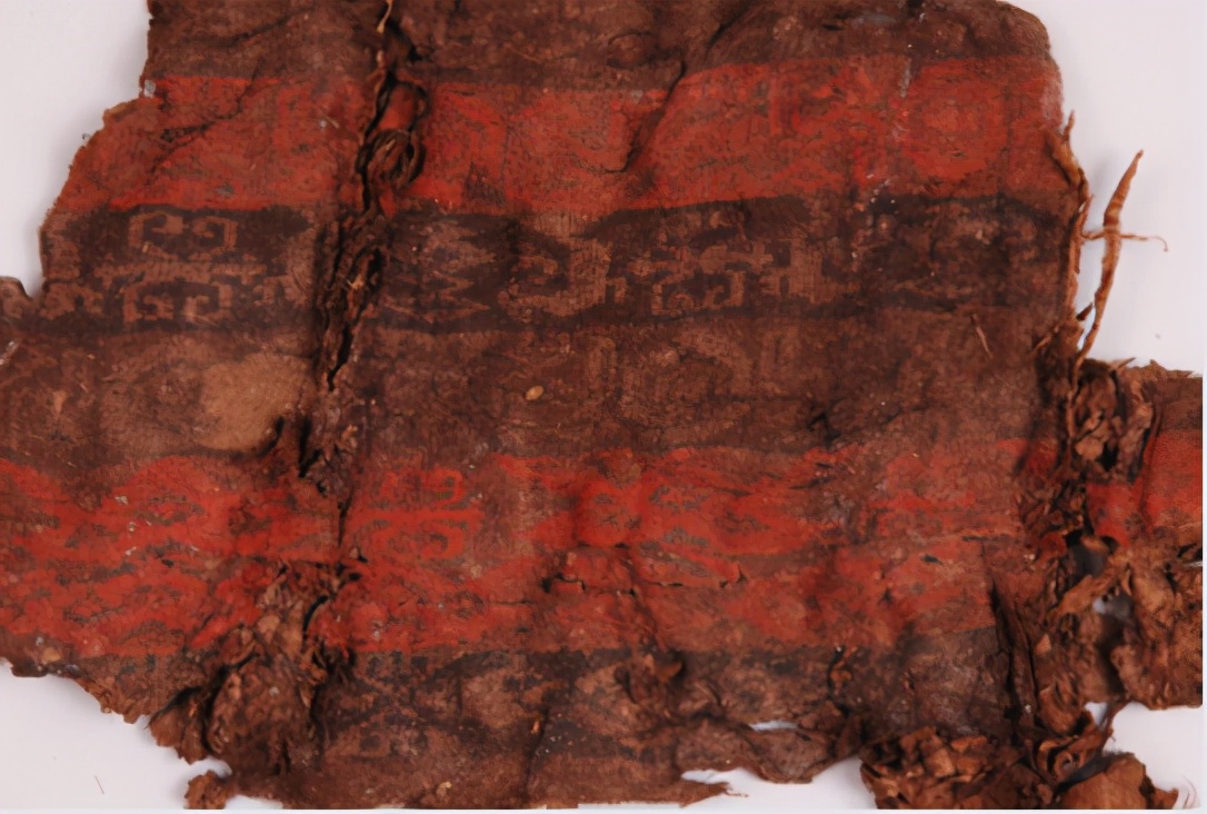 △這是郭家崗壹號墓裡被盜墓賊拋棄的戰國古絲綢片,朱紅鳳鳥紋織錦的色澤美輪美奐。