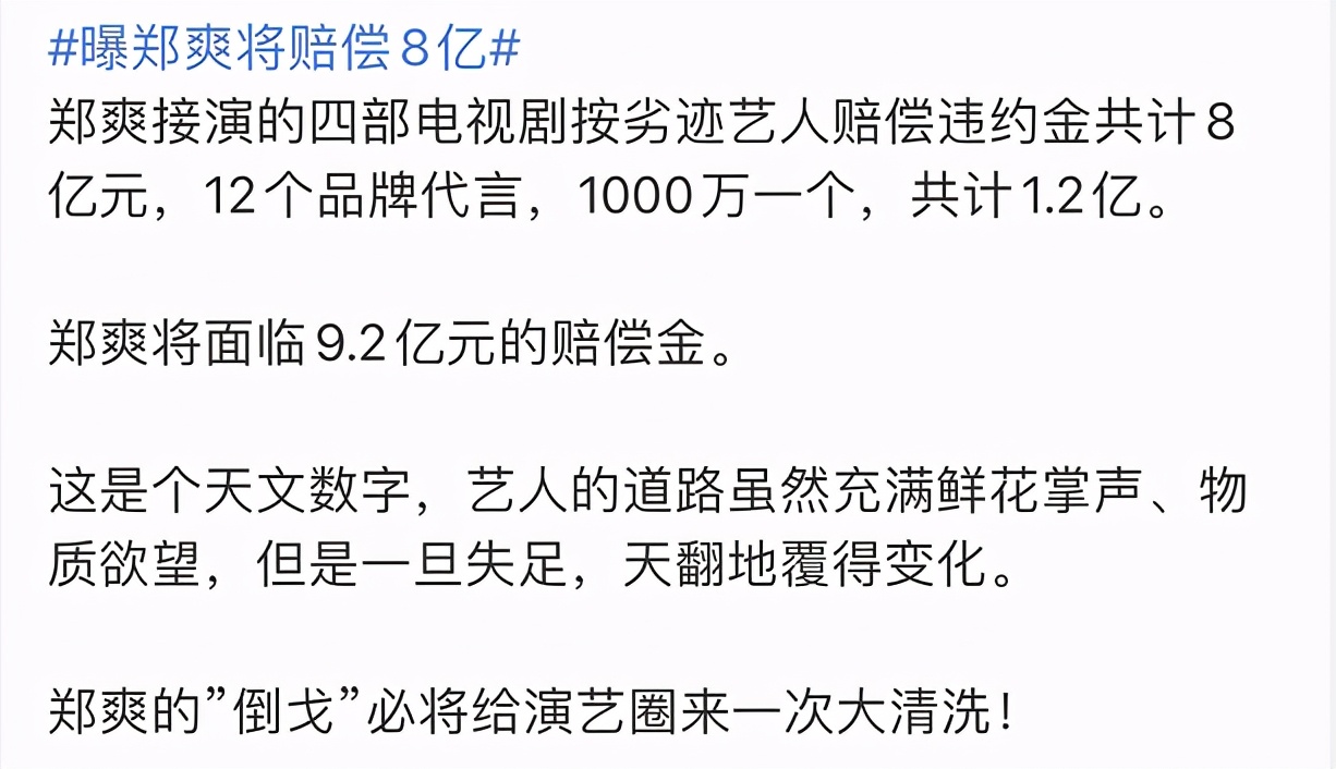 据消息称,郑爽还将面临高额的金额赔偿高达9.2亿的赔偿金,这个金额一点也不亚于当初范冰冰的金额,郑爽接演的四部电视剧按照劣迹艺人赔偿金共计8亿,12个品牌代言,每个赔偿1000万,共计1.2亿,这个天文数字,对于片酬超高的郑爽来说,无疑也是一种负担。