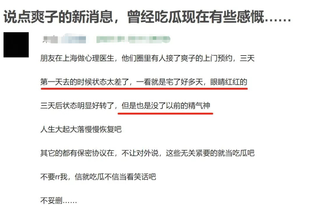 该网友还提到郑爽选择去美国谈判,可能和之前预约心理医生有关。此前有位知情人士爆料,郑爽预约了心理医生上门服务,郑爽自从代孕一事后,基本上一直待在上海的家里。郑爽经历封杀事件后,心理状态非常的脆弱,经过医生的开导诊断,逐渐认识到自己的错误,内心有愧于孩子,文中还说到郑爽决定放弃部分利益和谈。