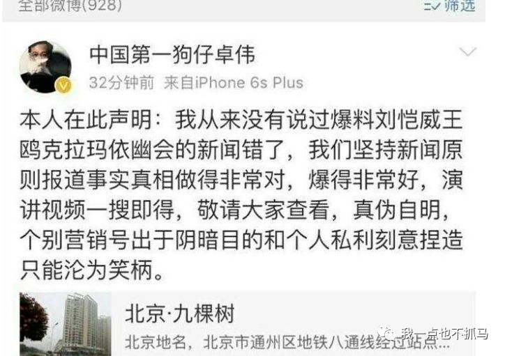 气得卓伟发微博澄清说:本人从来没说过爆料刘恺威王鸥在克拉玛依幽会的新闻错了,演讲视频一搜就能看到。