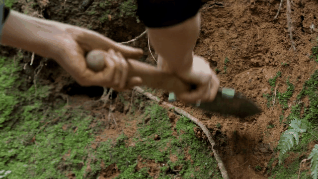 她最常去的便是离工作室不远的崇福山和大雄山,也就是她口中的“后山”。一路上山,她一路给我们介绍自己最喜欢的几个采土点。只见她跃过一条不窄的水沟,爬上一方陡陡的斜坡,便默不吭声地挖了起来,一待近半小时,试捏、检查黏性……