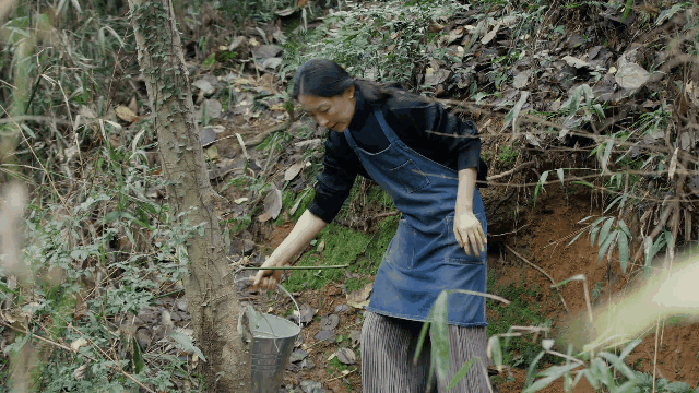 她拎起一个装着铲子等工具的铁皮水桶,穿上一件沾满了各色泥土的围裙,准备带着我们上山挖土。这是她创作过程的第一步。