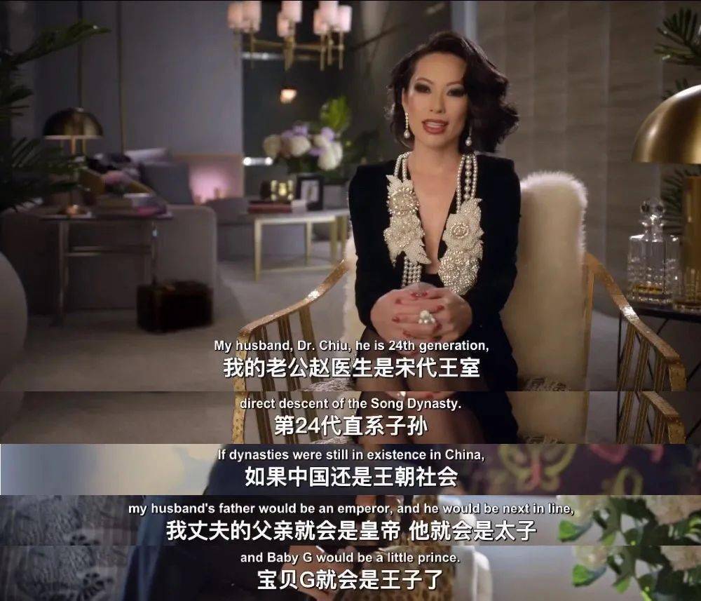 最深谙综艺剧本套路,一出场就为自己赚足眼球的Christine Chiu(赵姐)一上来就 自称“宋朝太子妃”,介绍她的整形医生老公是宋朝皇帝第24代后裔。还说中国还是帝制社会的话他们的儿子就是个小王子,就差没让大家下跪行礼了。