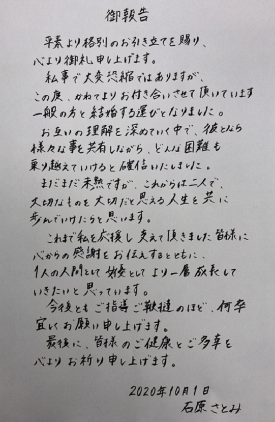 2020年10月,石原里美结婚的消息传出,老公是圈外人,各大媒体争相报道,随后,石原里美还晒出自己的亲笔信,认真的和大家宣布这个喜讯,可见对感情很是重视。