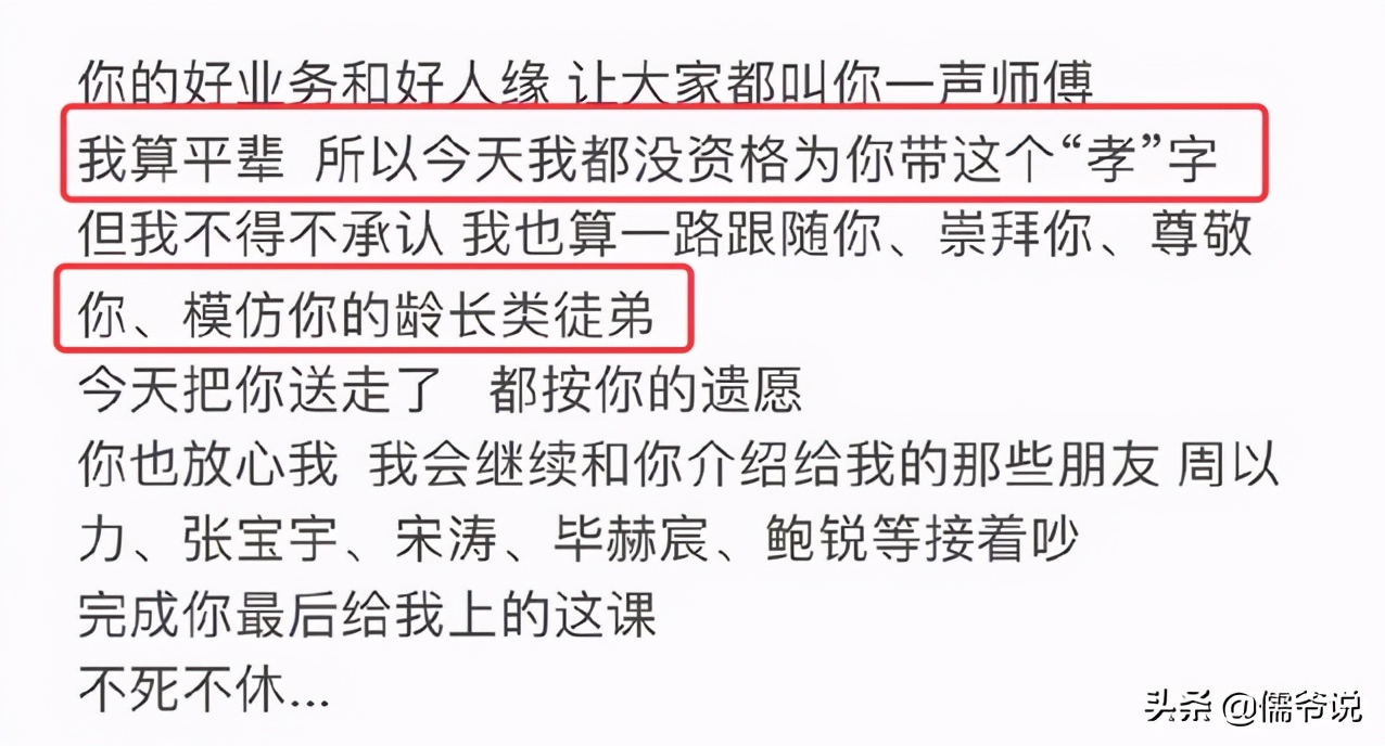 而在薛之谦的长文中,他最遗憾的并不是不能在赵英俊的追悼会上戴孝字。虽然两人关系非常好,而薛之谦也是一直当他是师父、当他是兄长。但是这改变不了两人是同辈的事实,所以戴孝字,注定不会是薛之谦。