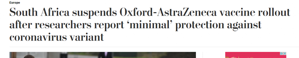 南非在有數據顯示其對輕度感染的保護作用最小之後,暫停了阿斯利康疫苗的推廣。