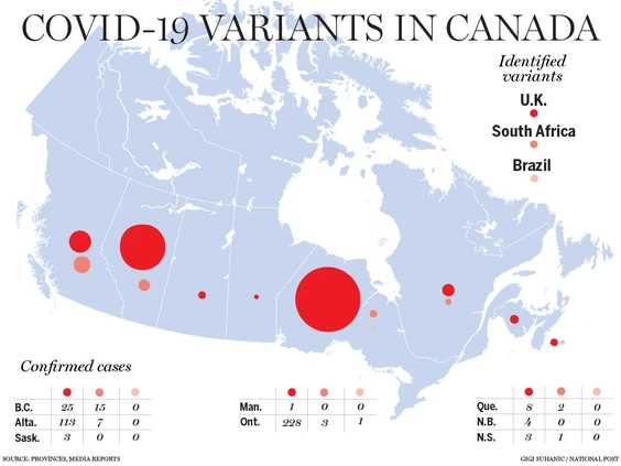 南非變體病例目前加拿大至少有28例,BC省病例數最多,為15例。