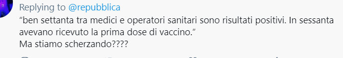 意大利70個醫護人員被新變種病毒感染,其中有60個是已經接受過第壹劑疫苗的。