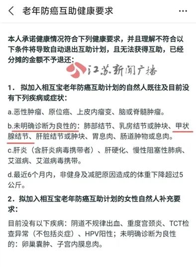 孫先生說,自己事後查詢了“相互寶”的健康要求,上面的確寫了未明確診斷為良性的甲狀腺結節不可以加入老年防癌互助計劃;但當初是線上購買,無人對母親的資料進行詳細審核,自己也不知道有此條款,直到此次母親病發後,“相互寶”調查員調查了母親的體檢記錄後,自己才知道母親2016年體檢時曾被查出甲狀腺結節。