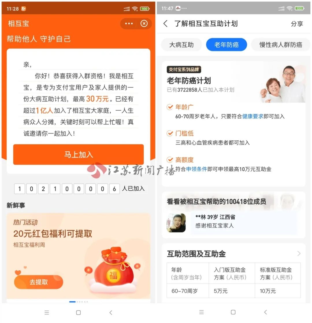 記者通過支付寶平台查詢“相互寶”發現,其首頁介紹是專為支付寶用戶及家人提供的壹份大病互助計劃,不是保險,最高30萬元,已經有超過1億人加入了“相互寶”,壹人生病眾人分攤,關鍵時刻可以幫上忙,其中老年防癌計劃是針對60至70周歲的老年人,叁高和心血管疾病患者都可加入,包含計劃條款、健康要求等諸多文字介紹。