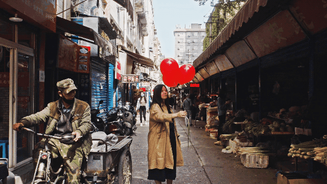 《放飛》中,菜場裡壹個個最平凡的食材,乘著紅色氣球飛出城中村,在廣闊的天空中遨游,就像壹點渺小的詩意的希望。