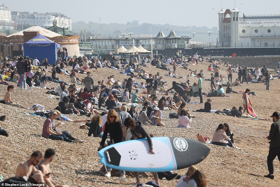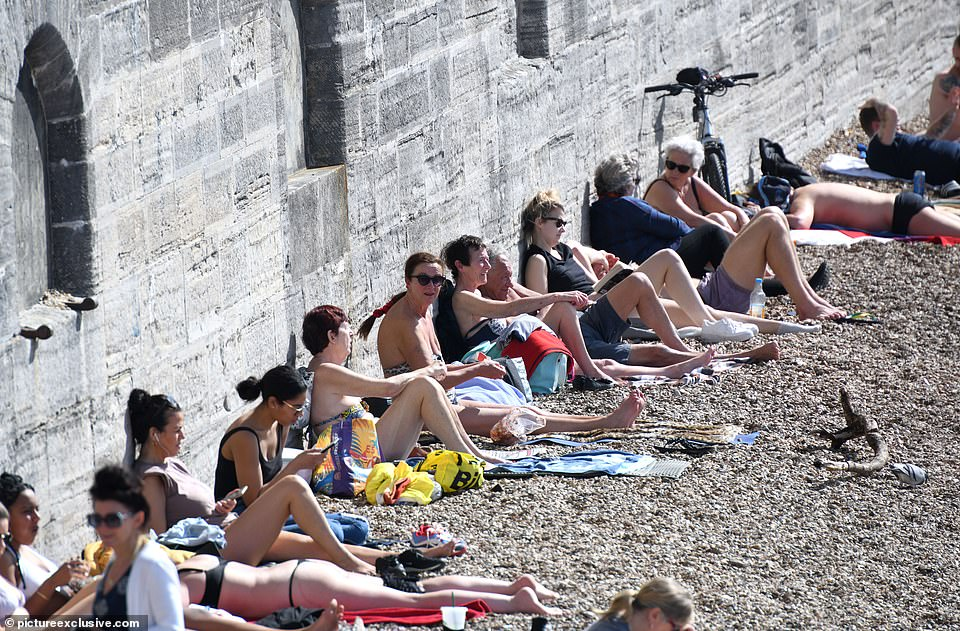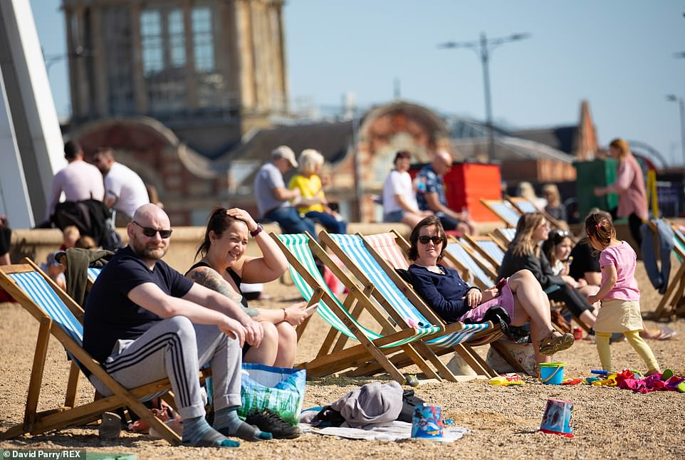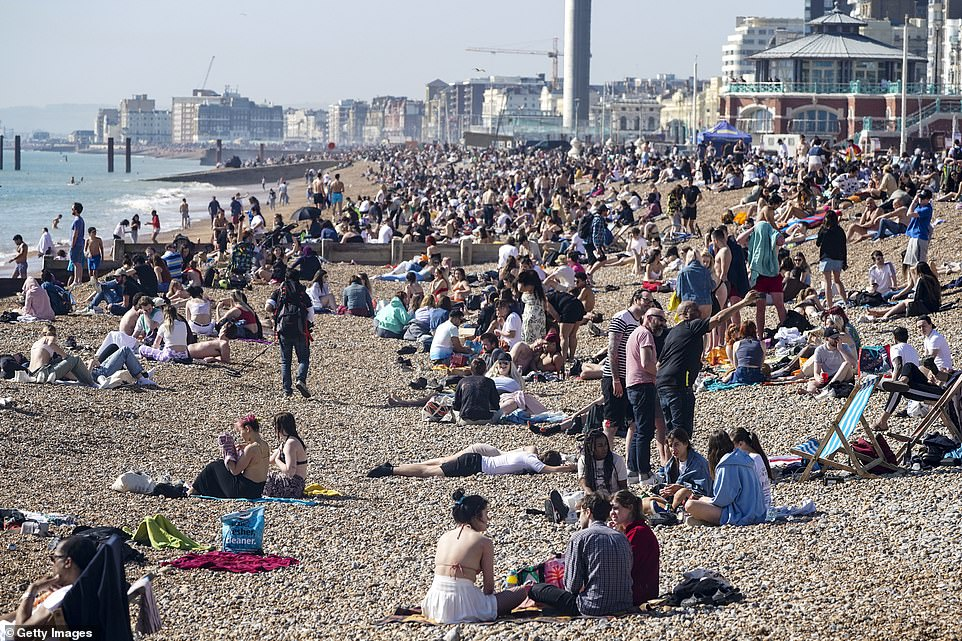 英國人聚集在全國各地的名勝景點,人們看到在英格蘭布萊頓的海灘上擠在壹起曬太陽