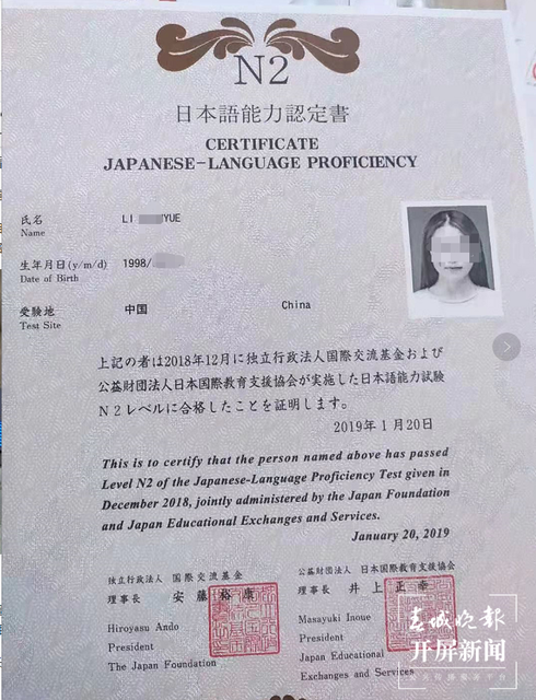 ▲李某月的日语等级证书