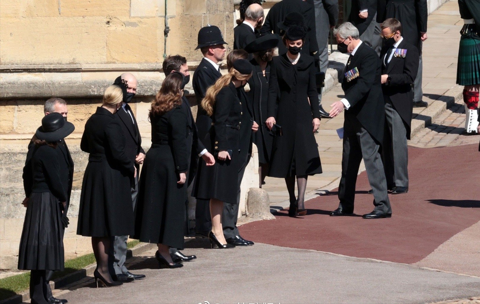 這次葬禮,凱特王妃、路易絲夫人和賽文子爵、碧翠絲公主夫婦等不參加游行儀式,而它們在抵達溫莎城堡後則直接進入教堂。凱特與威廉分開後,獨自抵達聖喬治教堂,黑紗遮面搭配半透視效果的絲襪,拾分正式。
