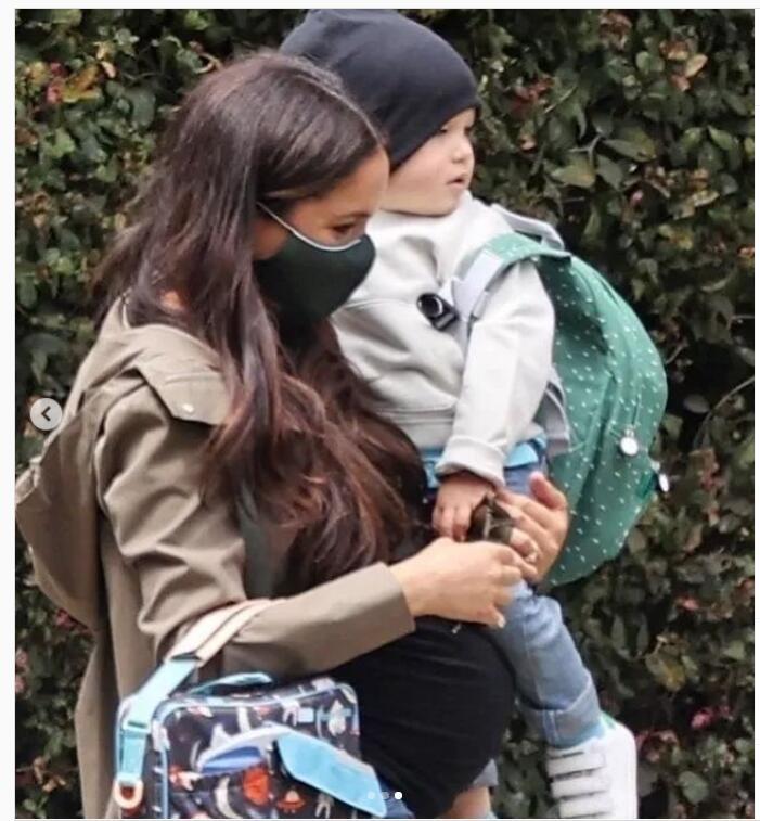 在這張被跟蹤記者偷拍的照片中,蘇塞克斯公爵夫人肚子更大了,但依然抱著她的兒子。
