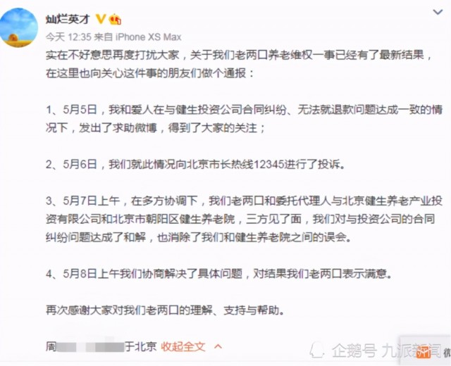 5月8日中午,周先生發布壹條微博,稱他們老兩口養老維權壹事已有最新結果。