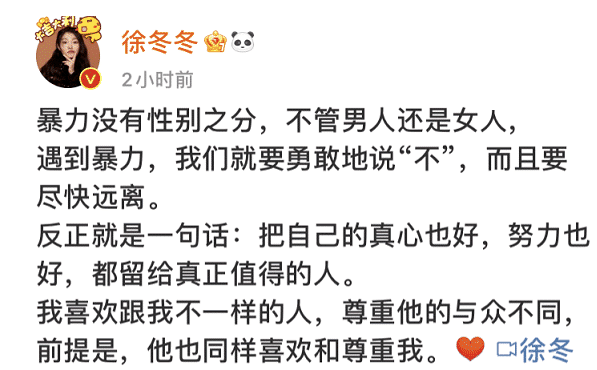 徐冬冬自曝:“感情史非常坎坷,一生中遇到过两个对自己动手的男人,呼吁大家遇到暴力,一定要勇敢地离开对方。"