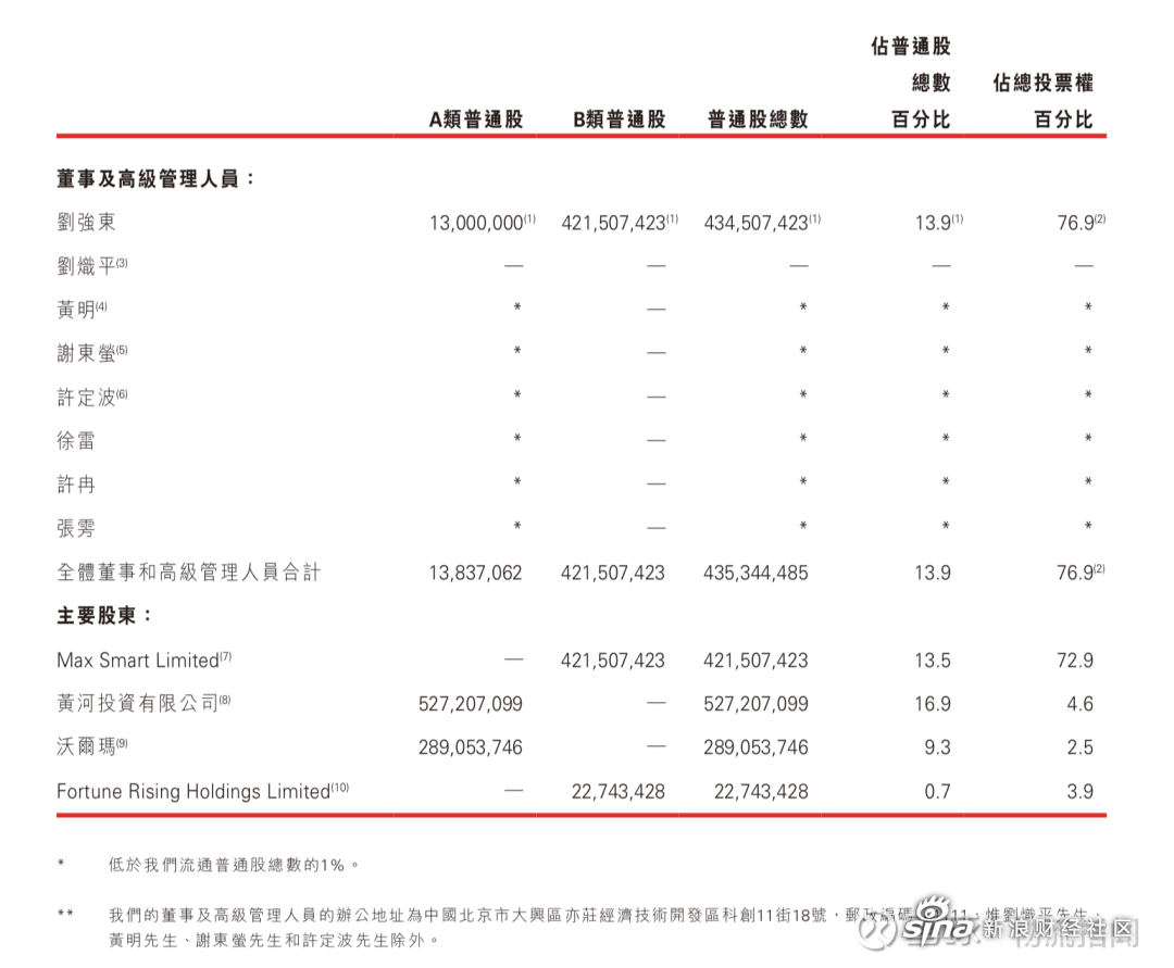 據京東2020年年報顯示,截至2021年2月28日,京東集團CEO劉強東持股為13.9%,有76.9%的投票權,其中,通過Max Smart Limited持股為13.5%,有72.9%的投票權。