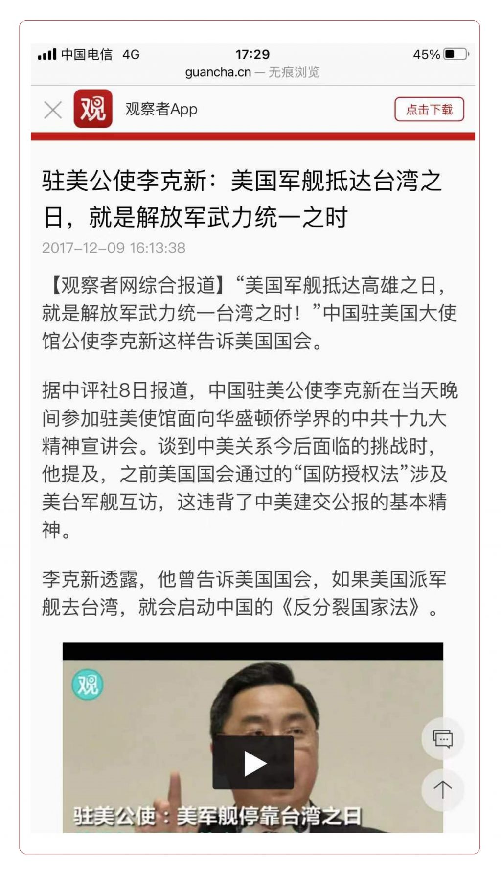 三年前中国驻美公使李克新表示,美国军机抵达台湾之日,就是解放军武力统一之时。(网络截图)
