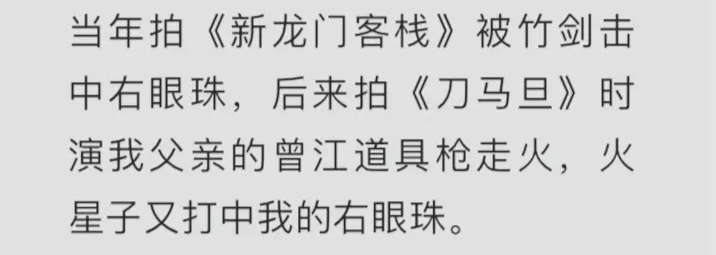 7月5日,林青霞在社交媒体上发表了一篇文章《我的右眼珠》,文章里面详细记录了她治疗白内障的过程。在文章中,她透露在早些年拍摄电影《龙门客栈》的时候不小心被竹剑击中右眼珠;后来拍《刀马旦》时,右眼珠又被火星子打中了。