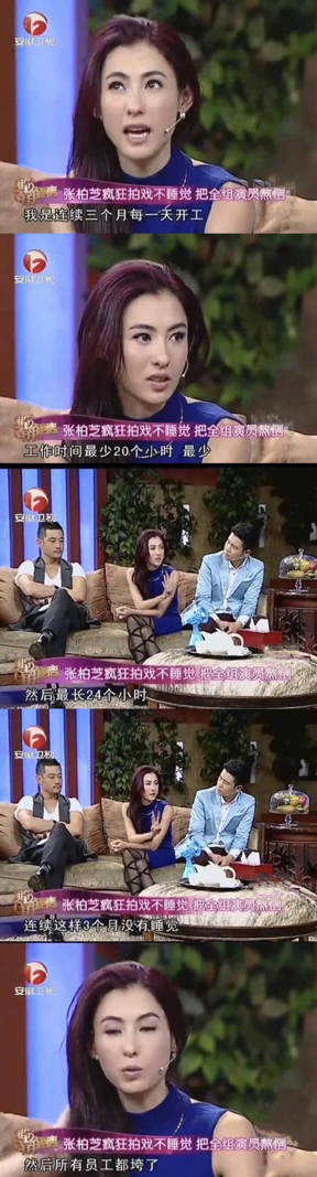 早期在节目中,张柏芝就说过,为了拍戏三个月没有休息过,每天工作最少20小时,最长24小时。