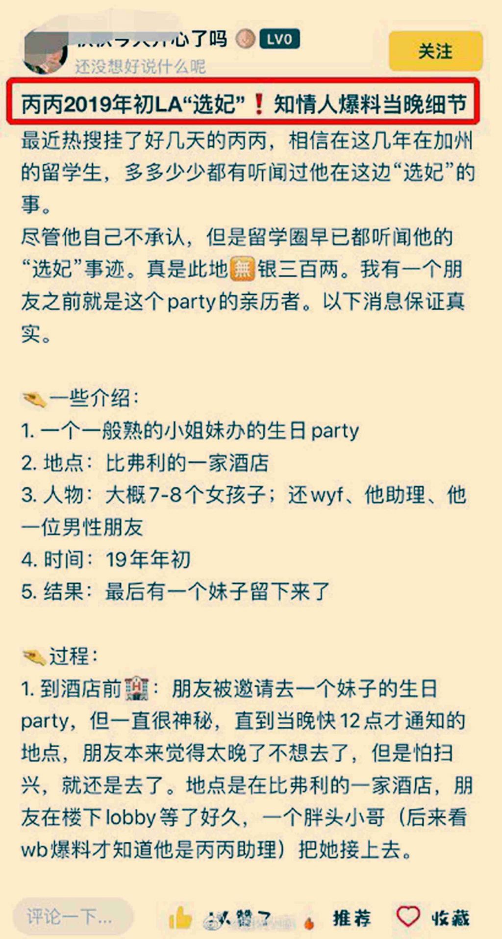 知情人爆料吴亦凡“选妃”细节。“丙丙”是网友调侃吴亦凡某时期长胖且不火了的称呼。“凡”谐音“烦”,“烦”不火了就是“页”,“页”胖了就是“丙”。“丙丙”由此而来。(微博@圈内大腕)