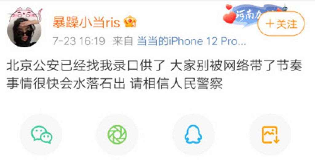 2021年7月23日,曾参加吴亦凡酒局的00后女生自曝称已到警局录口供,引发关注。(微博@暴躁小当ris )