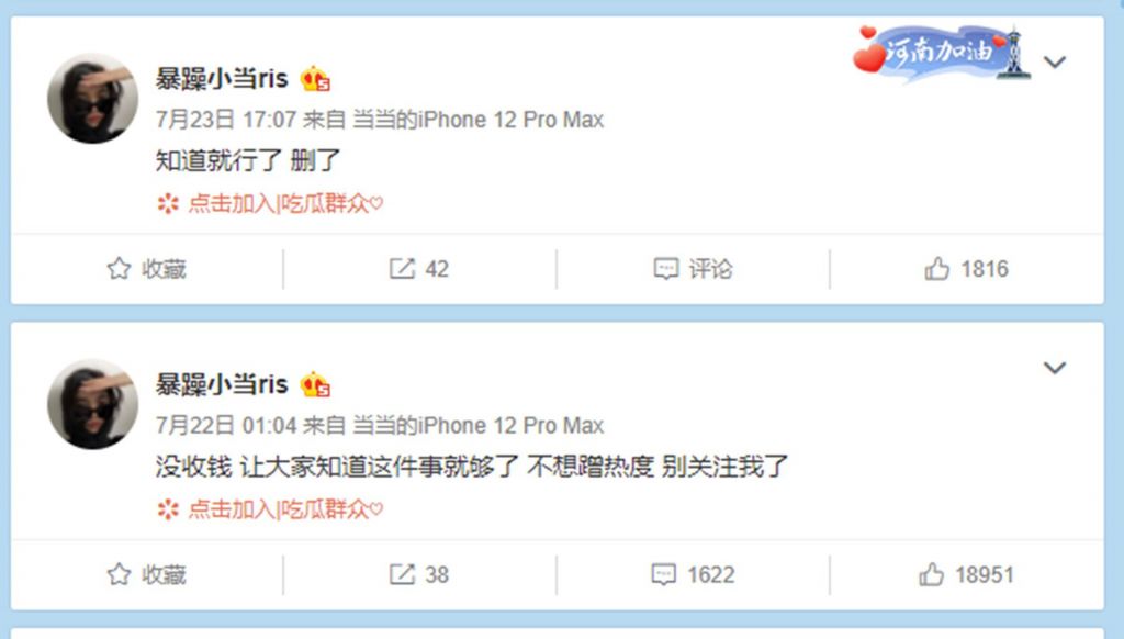 随后,她删除了录口供爆料的发文。(微博@暴躁小当ris )