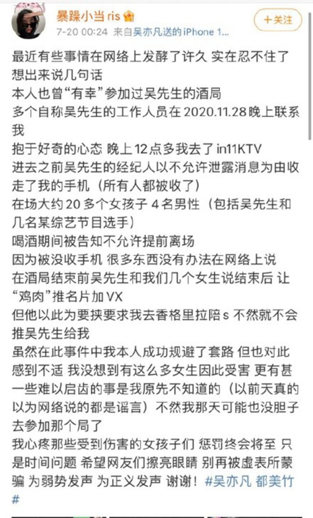 此前,该女生曾发文叙述了自己参加吴亦凡酒局的经历,表示虽然自己成功规避,但为那些受害的女生感到心疼,并相信惩罚终会将至。(微博@暴躁小当ris )