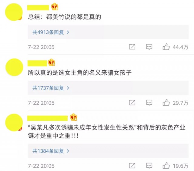 这件事的讨论,也从“吴亦凡和都美竹”,升级为“吴亦凡和数十名女生”,再升级为“吴亦凡背后的团队和所有的未成年女生”。