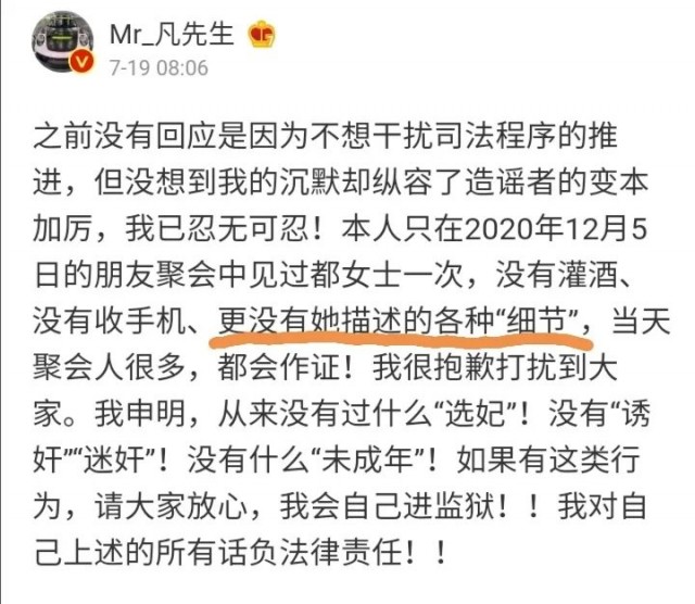 早前吴亦凡绝不道歉,强调两人只见了一面,现场还有其他人作证。在微博字里行间,都在起誓发愿地强调没有犯罪,不然会自己进监狱。