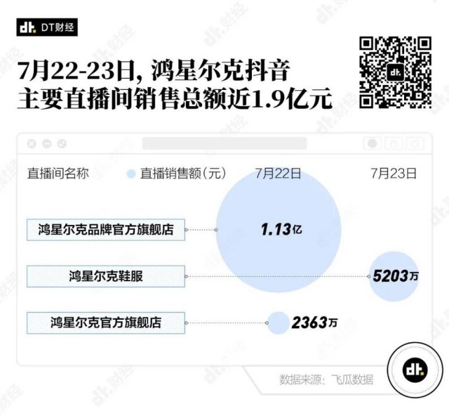 在抖音,“鸿星尔克品牌官方旗舰店”和“鸿星尔克官方旗舰店”两个账号22日直播销售额总和达到1.37亿元,“鸿星尔克鞋服”23日直播销售额也超过了5千万元。