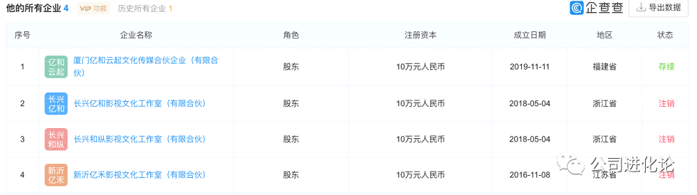 企查查显示,吴亦凡(WU YI FAN)共关联4家企业,其中存续状态仅1家,为厦门亿和云起文化传媒合伙企业(有限合伙),持股比例为99.99%,法定代表人为其表哥吴林。其余3家显示已注销,注销时间集中在2020年6月至9月,此前吴亦凡持股比例均为99.0%及以上。