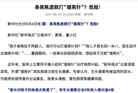 国社调查发现生长激素被一些焦虑的家长用来给孩子增高,并指出“国内一家生长激素龙头企业年收入连年增长。2016年至2020年的5年间,其年收入增长了4倍多,收入90%以上都来自生长激素相关产品。”