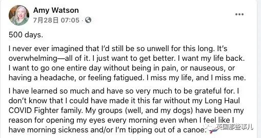 7月28日,是她感染新冠后的第500天,康复依然不理想…“500天了。我从没想过我会病这么长时间。一切都太难承受。我只想好起来,回到原来的生活。只想有一天,我可以完全不痛,不恶心,不头痛,不疲乏。我想念我的生活,想念原来的我…”