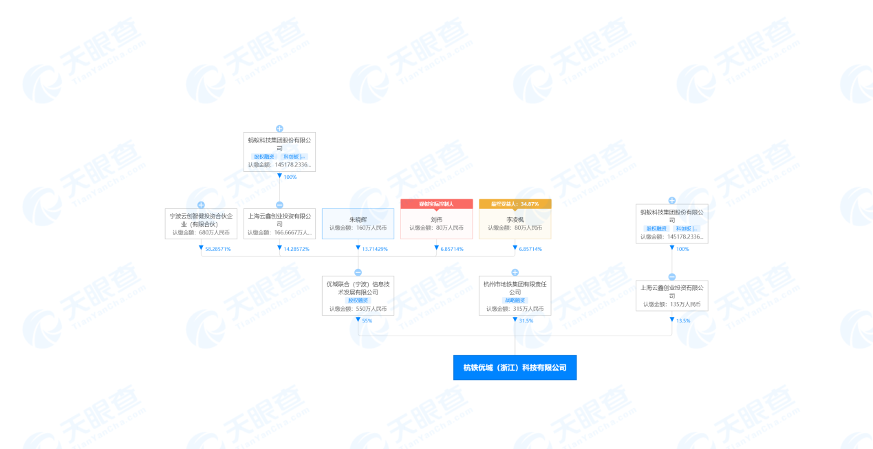 之後,在2019年11月,優城聯合作為大股東投資創立了杭鐵優城(浙江)科技有限公司。據天眼查APP顯示,其中,優城聯合占股55%,杭州地鐵集團占股31.5%,而螞蟻科技集團全資控股的上海雲鑫創業投資有限公司又投了135萬元,占股13.5%。